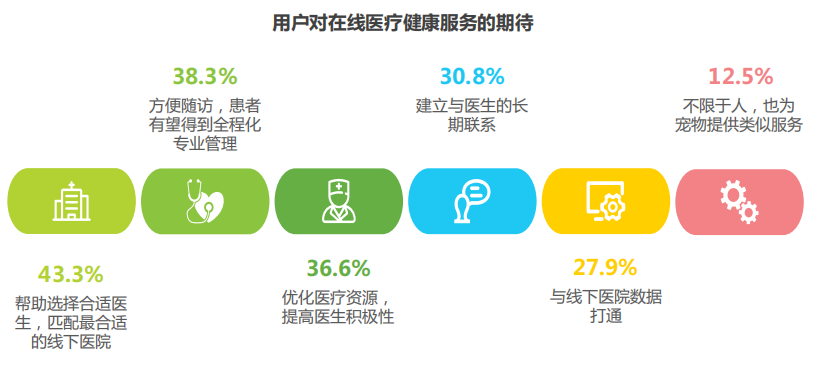 此外,用戶對于在線醫(yī)療健康服務(wù)的需求不斷延伸,橫向上,用戶期望得到從預(yù)防到診療、康復(fù)護理全鏈條的醫(yī)療健康服務(wù),縱向上,希望在線就診在效率、準(zhǔn)確性、專家的權(quán)威性認(rèn)證等方面得到保障。因此,服務(wù)的多樣化與精細化將成為在線醫(yī)療健康服務(wù)未來新的發(fā)展方向。