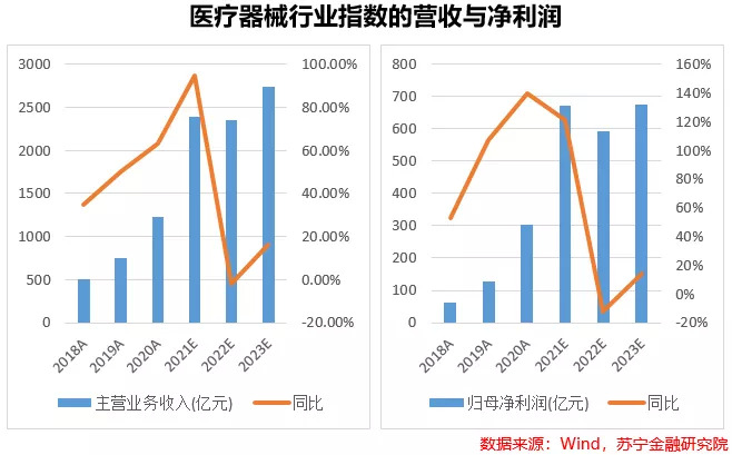 估值下降的背后是機(jī)構(gòu)對(duì)于醫(yī)療器械未來(lái)盈利較為悲觀的預(yù)期。從過(guò)去幾年醫(yī)療器械行業(yè)指數(shù)的盈利表現(xiàn)看,受到疫情對(duì)于醫(yī)療器械需求的爆發(fā)式增長(zhǎng),行業(yè)整體無(wú)論是收入還是凈利潤(rùn)都取得了年均40%以上的增長(zhǎng)。但在高基數(shù)的影響,以及未來(lái)疫情影響消退的預(yù)期下,機(jī)構(gòu)對(duì)于未來(lái)的增長(zhǎng)一致預(yù)期比較悲觀。