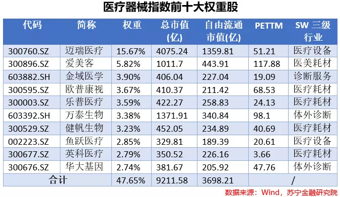 從醫(yī)療器械的權(quán)重股來(lái)看,邁瑞醫(yī)療作為A股中醫(yī)療設(shè)備的絕對(duì)龍頭,在指數(shù)中的權(quán)重占比較大,除邁瑞醫(yī)療之外的前十大權(quán)重成分股,整體權(quán)重比較分散,前十大權(quán)重股占比不足50%。