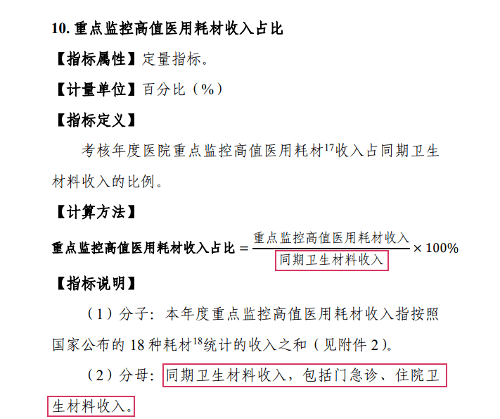 值得關(guān)注的是, 在今年4月國家衛(wèi)健委修訂并發(fā)布《國家三級公立醫(yī)院績效考核操作手冊(2022版)》時,也新增了“重點監(jiān)控高值醫(yī)用耗材收入占比”這一指標(biāo),考核年度醫(yī)院重點監(jiān)控高值醫(yī)用耗材收入占同期耗材總收入比例。