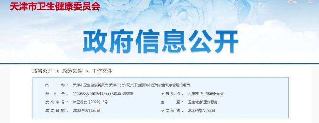 7月22日,天津市衛(wèi)生健康委發(fā)布《天津市衛(wèi)生健康委員會(huì)?天津市公安局關(guān)于加強(qiáng)我市醫(yī)院安全秩序管理的通告》(以下簡(jiǎn)稱《通告》)。