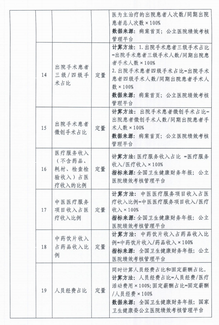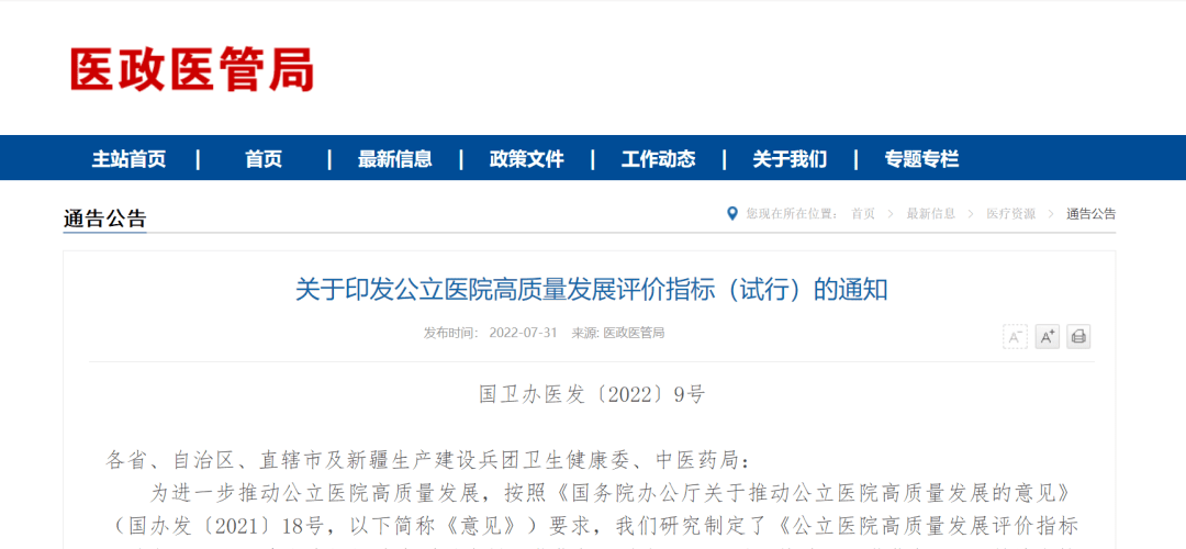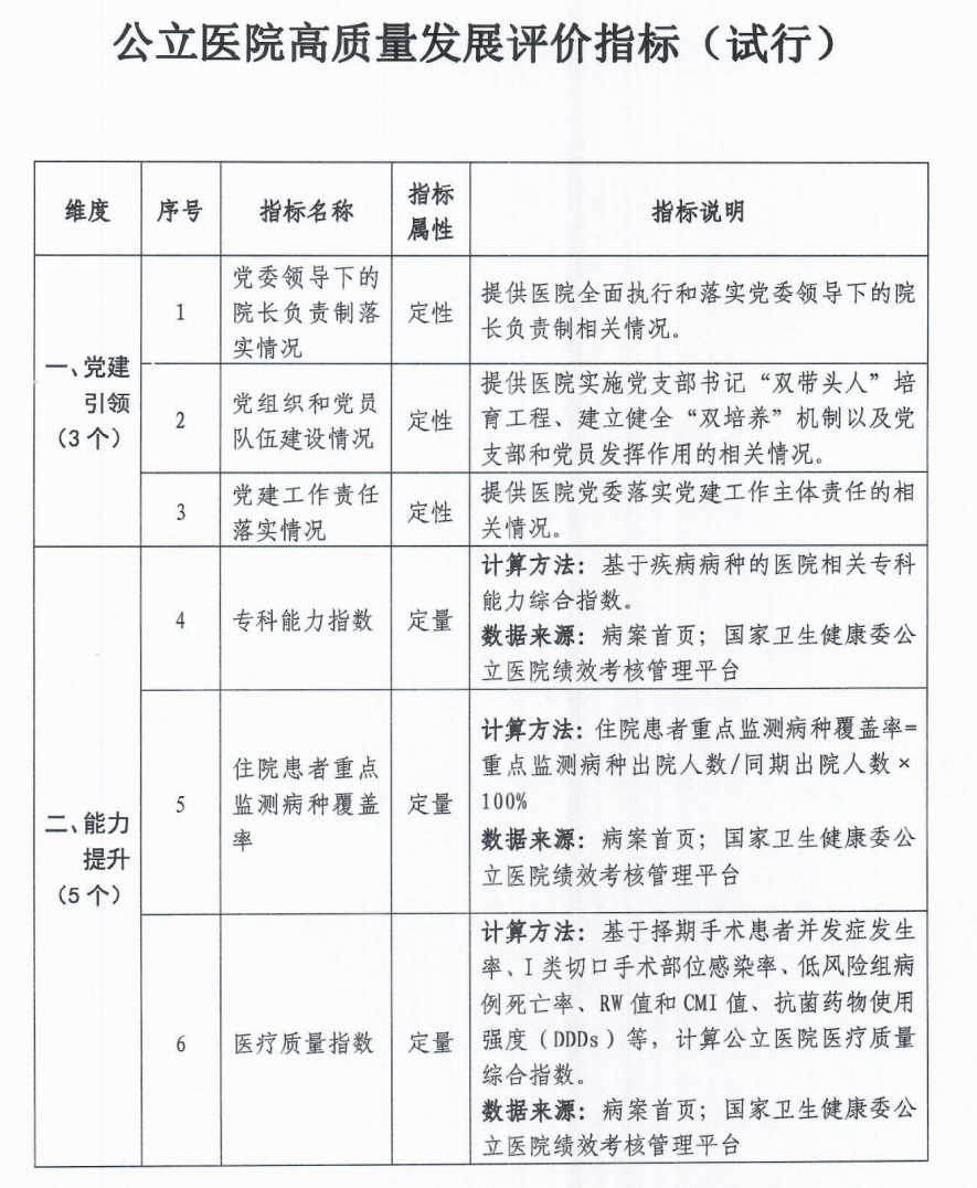 國(guó)家衛(wèi)生健康委要求,公立醫(yī)院高質(zhì)量發(fā)展評(píng)價(jià)工作與公立醫(yī)院績(jī)效考核工作同步推進(jìn)。省級(jí)衛(wèi)生健康行政部門(含中醫(yī)藥主管部門,下同)可以結(jié)合經(jīng)濟(jì)社會(huì)發(fā)展水平和重點(diǎn)工作,適當(dāng)補(bǔ)充反映本地區(qū)公立醫(yī)院高質(zhì)量發(fā)展的特色指標(biāo)。