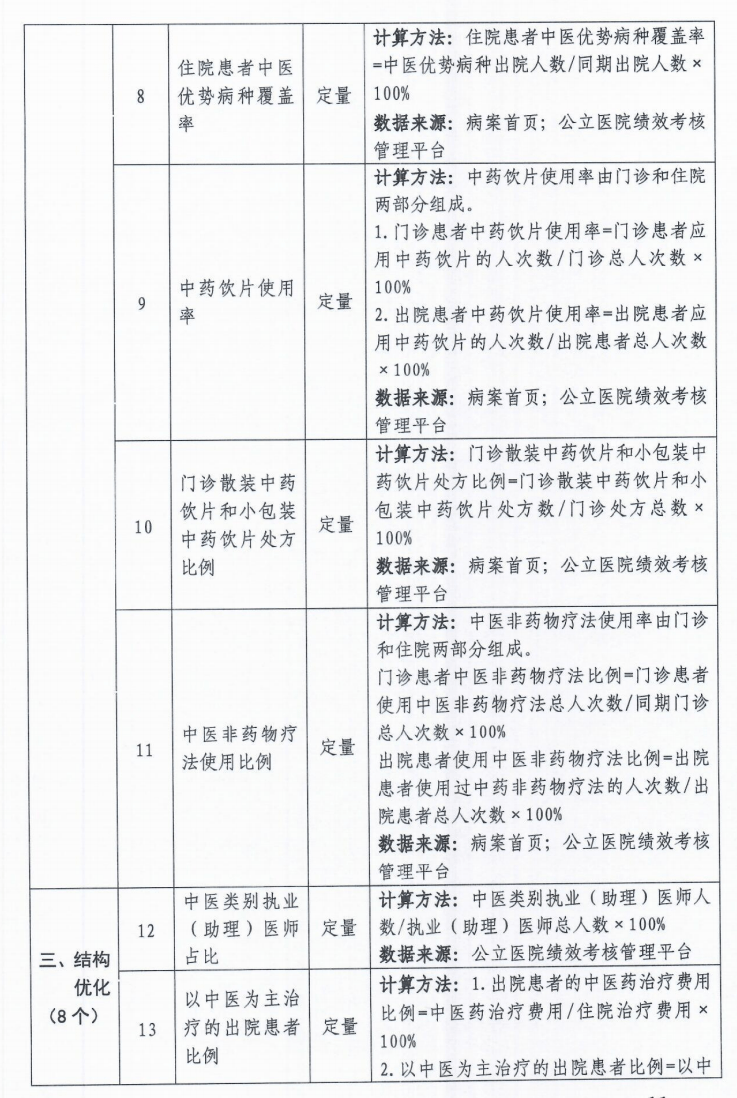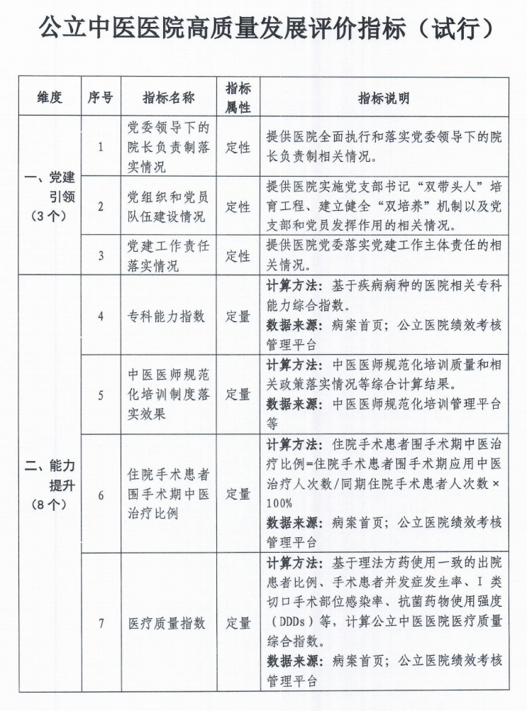 近日,國(guó)家衛(wèi)生健康委、國(guó)家中醫(yī)藥管理局聯(lián)合印發(fā)《公立醫(yī)院高質(zhì)量發(fā)展評(píng)價(jià)指標(biāo)(試行)》《公立中醫(yī)醫(yī)院高質(zhì)量發(fā)展評(píng)價(jià)指標(biāo)(試行)》,公布了公立醫(yī)院及公立中醫(yī)醫(yī)院高治療發(fā)展的評(píng)價(jià)指標(biāo),具體內(nèi)容圍繞黨建引領(lǐng)、能力提升、結(jié)構(gòu)優(yōu)化、創(chuàng)新增效、文化聚力5個(gè)方面展開,具體細(xì)化為18個(gè)和24個(gè)評(píng)價(jià)指標(biāo)。