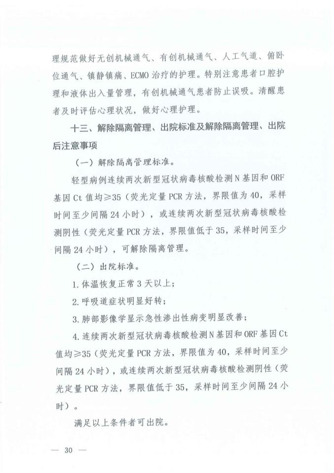 10、出院標(biāo)準(zhǔn)有較大更新:連續(xù)兩次新型冠狀病毒核酸檢測(cè)N基因和ORF基因Ct值均≥35(熒光定量PCR方法,界限值為40,采樣時(shí)間至少間隔24小時(shí)),或連續(xù)兩次新型冠狀病毒核酸檢測(cè)陰性(熒光定量PCR方法,界限值低于35,采樣時(shí)間至少間隔24小時(shí))。