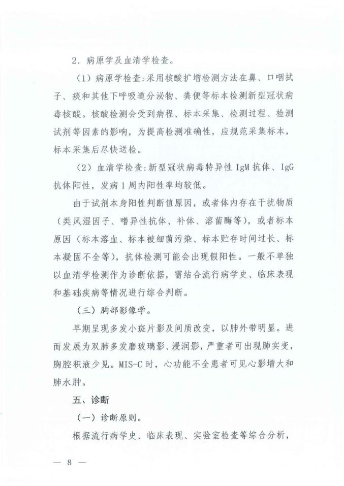 4、“診斷原則”提到:新型冠狀病毒核酸檢測(cè)陽(yáng)性為確診的首要標(biāo)準(zhǔn)。未接種新型冠狀病毒疫苗者,新型冠狀病毒特異性抗體檢測(cè)可作為診斷的參考依據(jù)。接種新型冠狀病毒疫苗者和既往感染新型冠狀病毒者,原則上抗體不作為診斷依據(jù)。