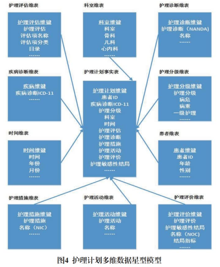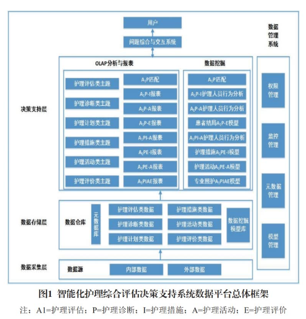 “數(shù)據(jù)信息交互、整合、共享,智能決策支持”構(gòu)成8級(jí)電子病歷系統(tǒng)核心評(píng)價(jià)標(biāo)準(zhǔn)。我國電子病歷應(yīng)用處于較低等級(jí),大多CDSS沒有提供常規(guī)警報(bào)提醒、摘要儀表盤和自動(dòng)信息檢索以外的功能。鑒于此,本研究基于數(shù)據(jù)驅(qū)動(dòng)的決策支持理念,探討將數(shù)據(jù)倉庫、聯(lián)機(jī)分析處理及數(shù)據(jù)挖掘技術(shù)引入智能化護(hù)理決策支持系統(tǒng),對(duì)系統(tǒng)數(shù)據(jù)信息獲取、存儲(chǔ)、集成、分析與呈現(xiàn)進(jìn)行全面規(guī)劃,并在此基礎(chǔ)上構(gòu)建基于數(shù)據(jù)倉庫的智能化護(hù)理決策支持系統(tǒng)大數(shù)據(jù)平臺(tái)。通過專業(yè)照護(hù)護(hù)理評(píng)估、診斷、計(jì)劃、措施、活動(dòng)及評(píng)價(jià)數(shù)據(jù)交互整合、多維分析、挖掘、知識(shí)發(fā)現(xiàn),為數(shù)據(jù)驅(qū)動(dòng)的專業(yè)照護(hù)智能決策支持系統(tǒng)研發(fā)與實(shí)現(xiàn)提供有益參考。
