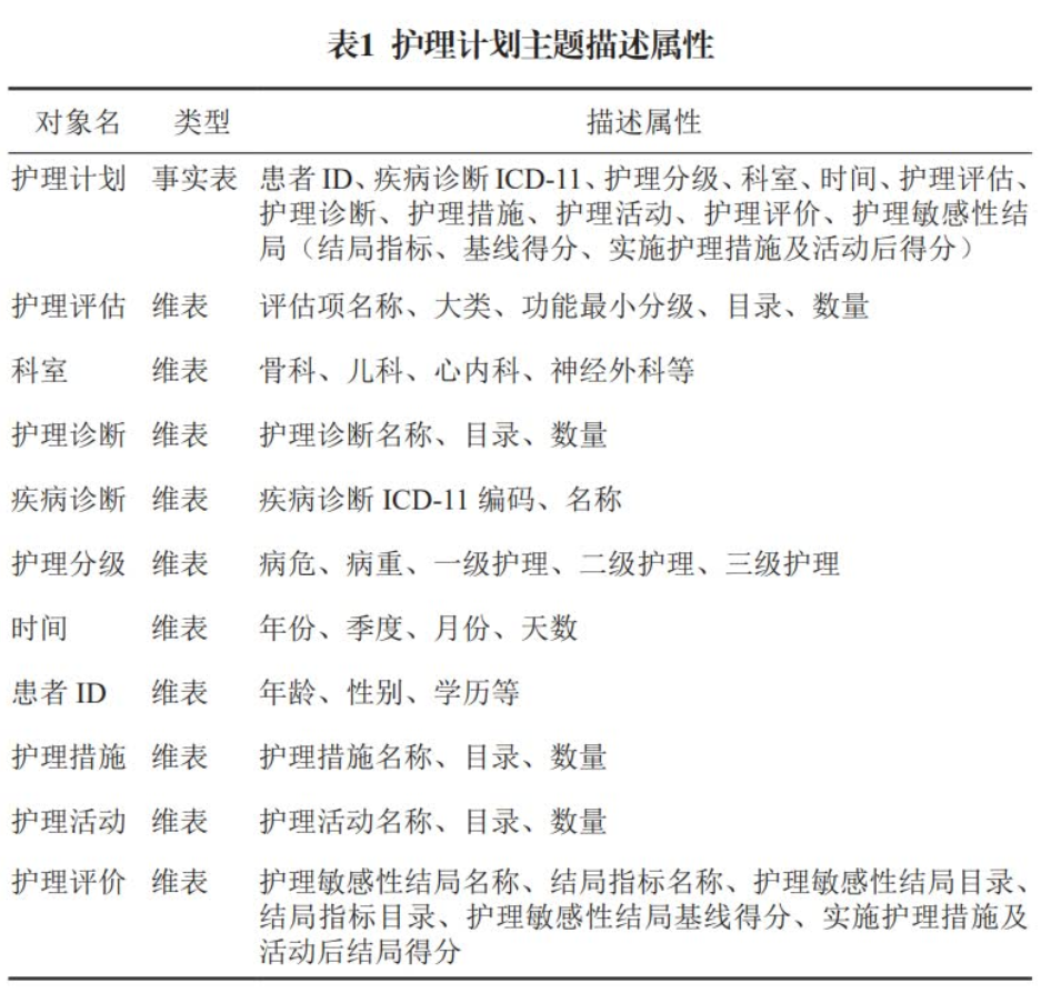 主題域確定后,采用星形結(jié)構(gòu)對(duì)護(hù)理計(jì)劃主題進(jìn)行多維數(shù)據(jù)事實(shí)表及維表設(shè)計(jì),見圖4,具體維度涉及護(hù)理評(píng)估、護(hù)理診斷、護(hù)理措施、護(hù)理活動(dòng)、護(hù)理評(píng)價(jià)、時(shí)間、科室、疾病診斷、護(hù)理分級(jí)及患者年齡。根據(jù)分析需求,整理系統(tǒng)護(hù)理計(jì)劃事實(shí)表及維表描述屬性,見表1。