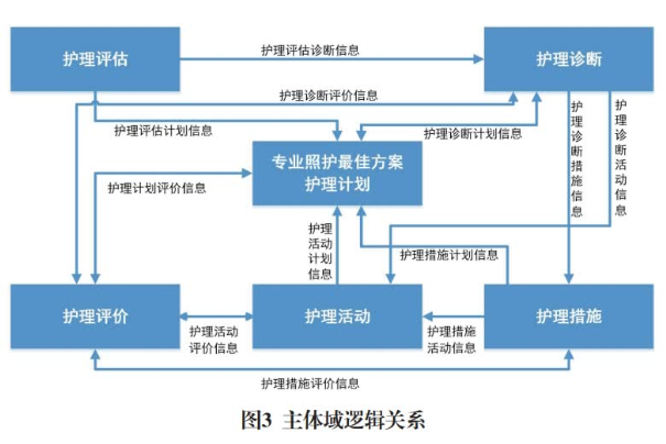 根據(jù)智能化護(hù)理綜合評(píng)估決策需求和系統(tǒng)邊界劃分,確定人、健康、環(huán)境、護(hù)理4個(gè)主題,通過護(hù)理評(píng)估、護(hù)理診斷、護(hù)理計(jì)劃、護(hù)理措施、護(hù)理活動(dòng)、護(hù)理評(píng)價(jià)聯(lián)系。將數(shù)據(jù)模型按照護(hù)理評(píng)估、護(hù)理診斷、護(hù)理計(jì)劃、護(hù)理措施、護(hù)理活動(dòng)、護(hù)理評(píng)價(jià)6個(gè)基本主題域進(jìn)行邏輯結(jié)構(gòu)設(shè)計(jì),建立以專業(yè)照護(hù)為中心的主題視圖,各主題域關(guān)系見圖3。