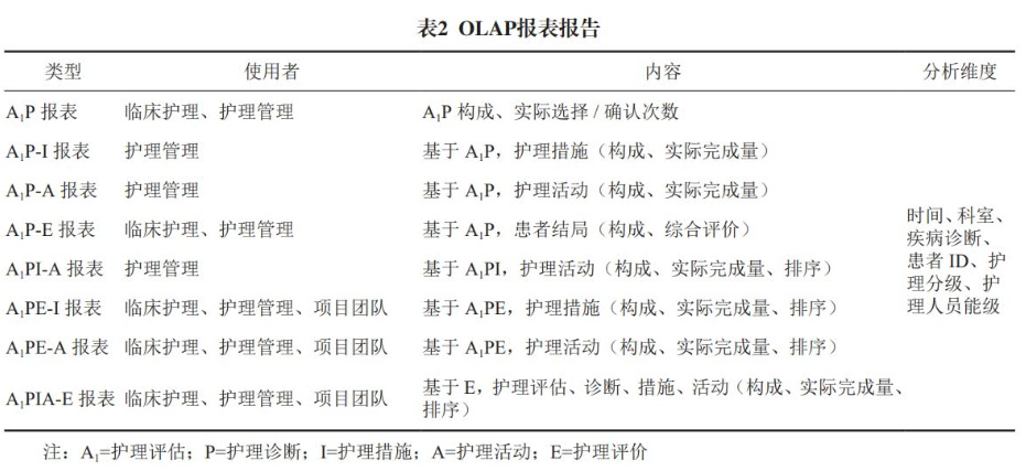 通過聯(lián)機(jī)分析處理(on--line analytical processing,OLAP)工具針對(duì)特定問題對(duì)數(shù)據(jù)集中的數(shù)據(jù)進(jìn)行訪問與多維分析。通過對(duì)5類數(shù)據(jù),即護(hù)理評(píng)估、護(hù)理診斷、護(hù)理措施、護(hù)理活動(dòng)、護(hù)理評(píng)價(jià)進(jìn)行多維數(shù)據(jù)分析與報(bào)表設(shè)計(jì),為決策者提供直觀、清晰的可視化分析結(jié)果,見表2。