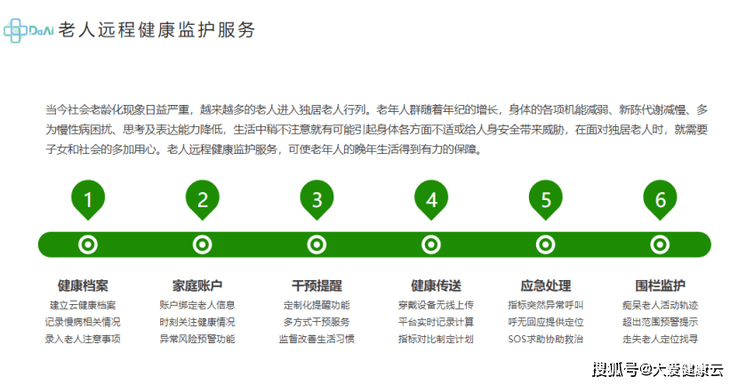 對于這樣一個普遍的社會問題大愛健康云平臺的老人運程監(jiān)護服務(wù)就能很好的解決子女不在身邊的后顧之憂,平臺的包含健康檔案、家庭賬戶、干預提醒、應(yīng)急處理、圍欄監(jiān)護等功能可使老年人的晚年生活得到有力的保障。