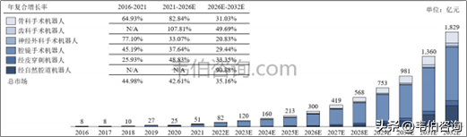 中國(guó)手術(shù)機(jī)器人市場(chǎng)預(yù)計(jì)保持較高水平的增長(zhǎng),2021年中國(guó)手術(shù)機(jī)器人市場(chǎng)規(guī)模約51億人民幣,預(yù)計(jì)未來(lái)五年將以42.61%的年復(fù)合增長(zhǎng)率增長(zhǎng),在2026年市場(chǎng)規(guī)模達(dá)到約300億人民幣,于2032年達(dá)到約1,829億人民幣。