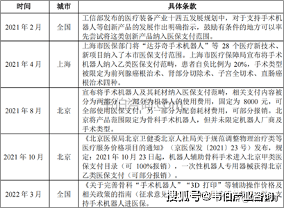 近年來(lái),境內(nèi)各省市針對(duì)手術(shù)機(jī)器人陸續(xù)出臺(tái)若干基本醫(yī)療保險(xiǎn)政策和商業(yè)醫(yī)療保險(xiǎn)政策,為各類(lèi)患者接受機(jī)器人輔助手術(shù)提供支持。該類(lèi)保險(xiǎn)政策不斷出臺(tái),醫(yī)保覆蓋范圍也進(jìn)一步擴(kuò)大,政策的陸續(xù)執(zhí)行有望降低患者經(jīng)濟(jì)負(fù)擔(dān),為更多患者主動(dòng)選擇手術(shù)機(jī)器人輔助手術(shù)創(chuàng)造條件。未來(lái)隨著手術(shù)機(jī)器人普及程度增加,基本醫(yī)療保險(xiǎn)也會(huì)隨之跟進(jìn),更多患者將會(huì)享受到更好的醫(yī)療保險(xiǎn)服務(wù)。