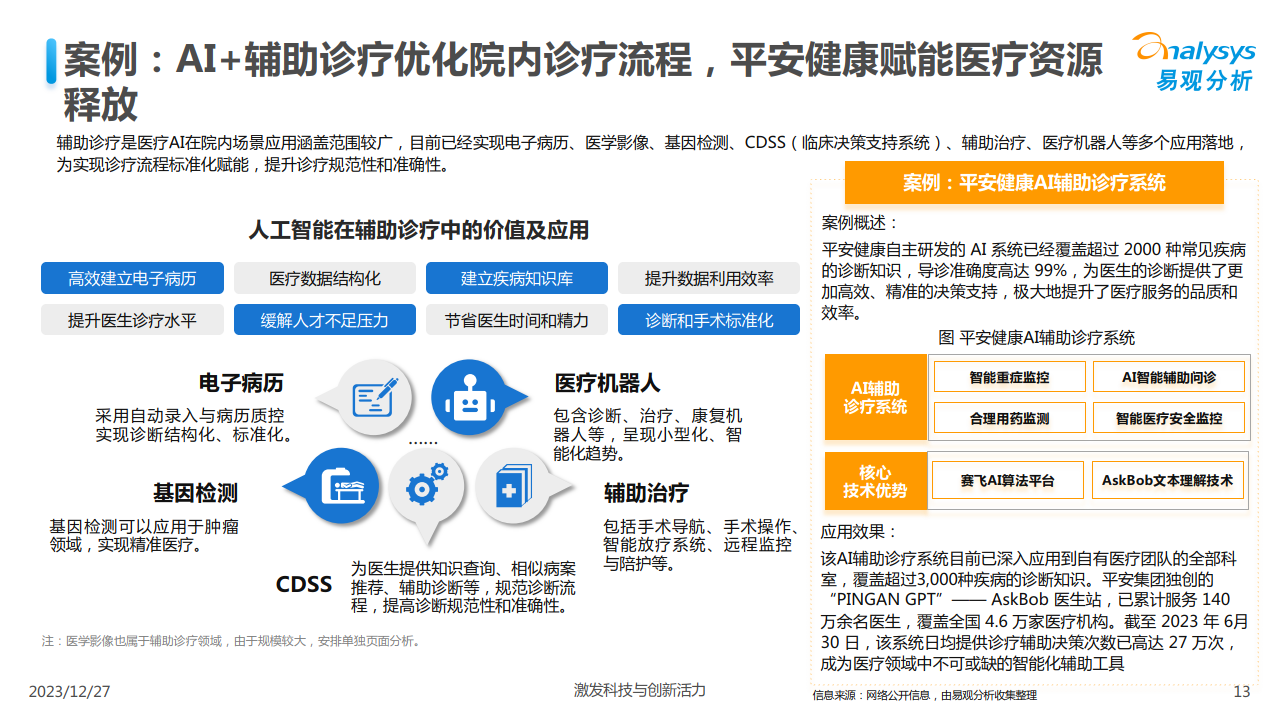 輔助診療是醫(yī)療AI在院內(nèi)場景應(yīng)用涵蓋范圍較廣,目前已經(jīng)實(shí)現(xiàn)電子病歷、醫(yī)學(xué)影像、基因檢測、CDSS(臨床決策支持系統(tǒng))、輔助治療、醫(yī)療機(jī)器人等多個(gè)應(yīng)用落地, 為實(shí)現(xiàn)診療流程標(biāo)準(zhǔn)化賦能,提升診療規(guī)范性和準(zhǔn)確性。
