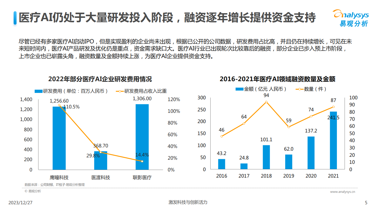 盡管已經(jīng)有多家醫(yī)療AI啟動(dòng)IPO,但是實(shí)現(xiàn)盈利的企業(yè)尚未出現(xiàn),根據(jù)已公開的公司數(shù)據(jù),研發(fā)費(fèi)用占比高,并且仍在持續(xù)增長,可見在未 來短時(shí)間內(nèi),醫(yī)療AI產(chǎn)品研發(fā)及優(yōu)化仍是重點(diǎn),資金需求缺口大。醫(yī)療AI行業(yè)已出現(xiàn)輪次比較靠后的融資,部分企業(yè)已步入預(yù)上市階段, 上市企業(yè)也已嶄露頭角,融資數(shù)量及金額持續(xù)上漲,為醫(yī)療AI企業(yè)提供資金支持。