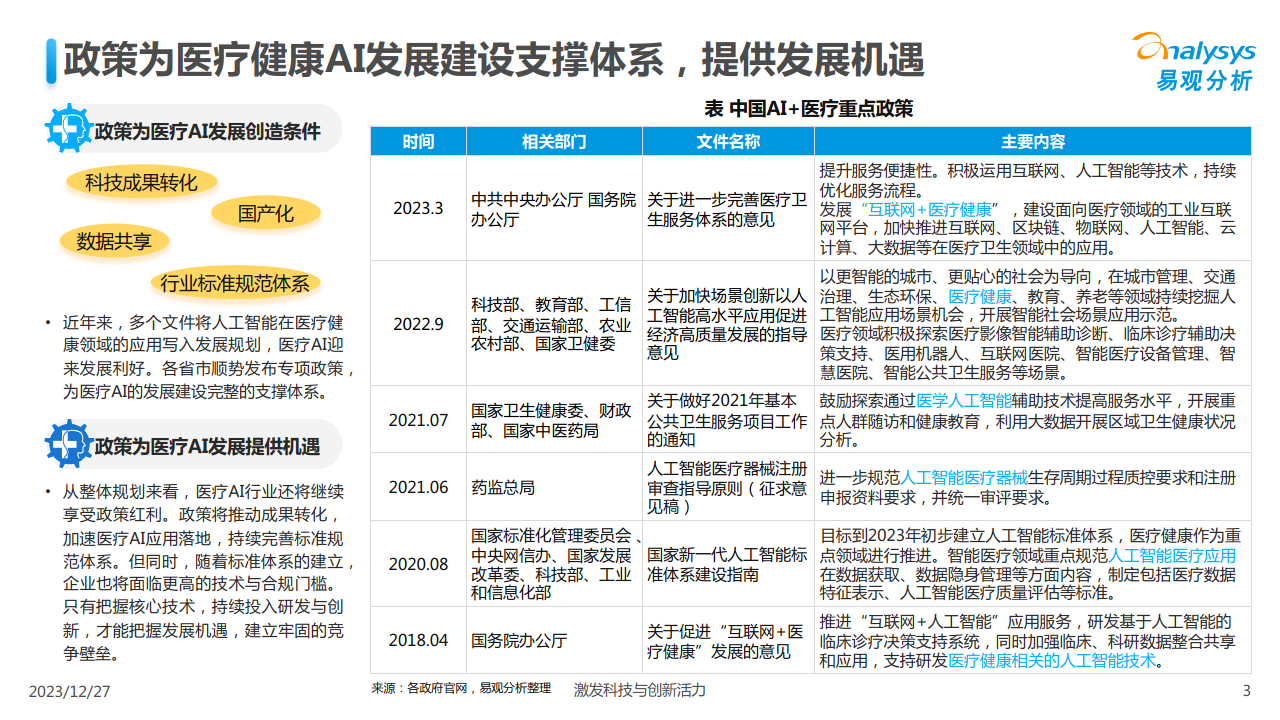 ? 近年來,多個(gè)文件將人工智能在醫(yī)療健 康領(lǐng)域的應(yīng)用寫入發(fā)展規(guī)劃,醫(yī)療AI迎來發(fā)展利好。各省市順勢發(fā)布專項(xiàng)政策, 為醫(yī)療AI的發(fā)展建設(shè)完整的支撐體系。