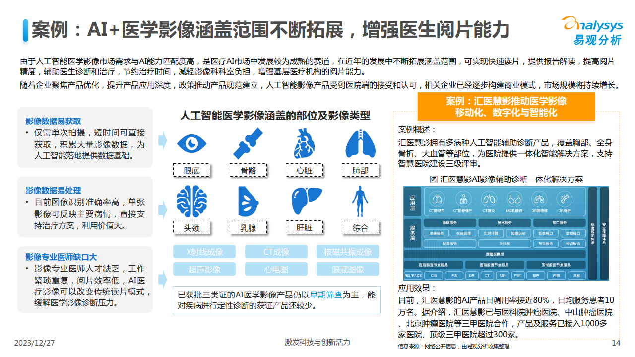 由于人工智能醫(yī)學(xué)影像市場需求與AI能力匹配度高,是醫(yī)療AI市場中發(fā)展較為成熟的賽道,在近年的發(fā)展中不斷拓展涵蓋范圍,可實(shí)現(xiàn)快速讀片,提供報(bào)告解讀,提高閱片精度,輔助醫(yī)生診斷和治療,節(jié)約治療時(shí)間,減輕影像科科室負(fù)擔(dān),增強(qiáng)基層醫(yī)療機(jī)構(gòu)的閱片能力。