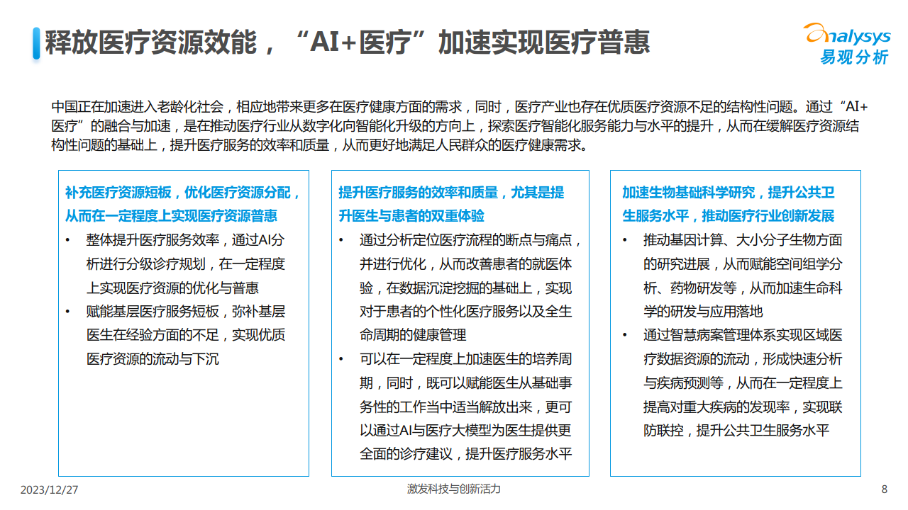 中國正在加速進(jìn)入老齡化社會(huì),相應(yīng)地帶來更多在醫(yī)療健康方面的需求,同時(shí),醫(yī)療產(chǎn)業(yè)也存在優(yōu)質(zhì)醫(yī)療資源不足的結(jié)構(gòu)性問題。通過“AI+ 醫(yī)療”的融合與加速,是在推動(dòng)醫(yī)療行業(yè)從數(shù)字化向智能化升級(jí)的方向上,探索醫(yī)療智能化服務(wù)能力與水平的提升,從而在緩解醫(yī)療資源結(jié)構(gòu)性問題的基礎(chǔ)上,提升醫(yī)療服務(wù)的效率和質(zhì)量,從而更好地滿足人民群眾的醫(yī)療健康需求。