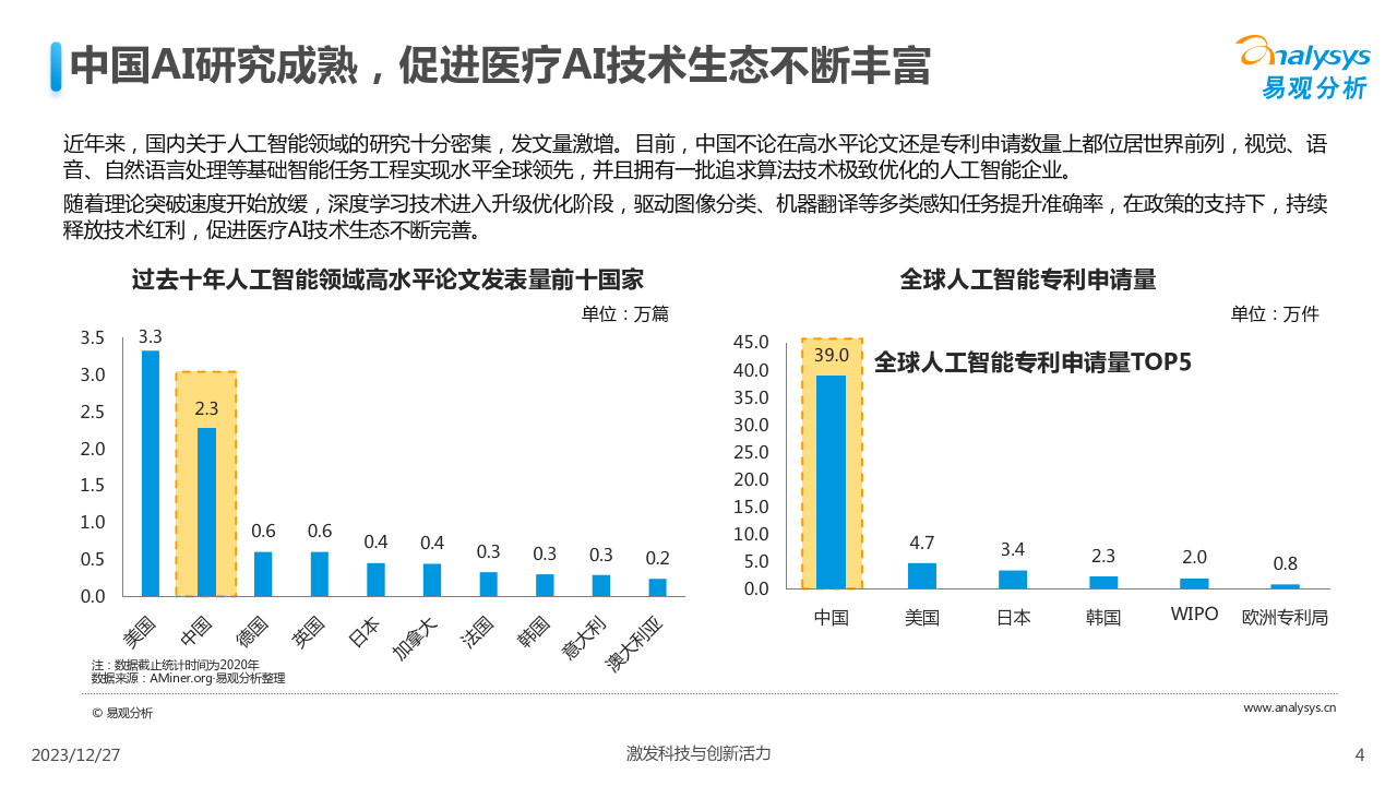 近年來,國內(nèi)關(guān)于人工智能領(lǐng)域的研究十分密集,發(fā)文量激增。目前,中國不論在高水平論文還是專利申請數(shù)量上都位居世界前列,視覺、語音、自然語言處理等基礎(chǔ)智能任務(wù)工程實(shí)現(xiàn)水平全球領(lǐng)先,并且擁有一批追求算法技術(shù)極致優(yōu)化的人工智能企業(yè)。隨著理論突破速度開始放緩,深度學(xué)習(xí)技術(shù)進(jìn)入升級(jí)優(yōu)化階段,驅(qū)動(dòng)圖像分類、機(jī)器翻譯等多類感知任務(wù)提升準(zhǔn)確率,在政策的支持下,持續(xù)釋放技術(shù)紅利,促進(jìn)醫(yī)療AI技術(shù)生態(tài)不斷完善。