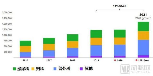 到了2009年,婦科成為手術(shù)量最大的領(lǐng)域,其中以機(jī)器人輔助子宮切除術(shù)為主,主要因手術(shù)機(jī)器人在病態(tài)肥胖、子宮過(guò)大、盆腔嚴(yán)重粘連等復(fù)雜病例子宮切除術(shù)中具備視野、仿真、震顫濾過(guò)、狹窄空間操作穩(wěn)定、視覺(jué)放大等優(yōu)勢(shì),術(shù)后具備住院時(shí)間短的優(yōu)勢(shì)。目前美國(guó)每年仍有20萬(wàn)~25萬(wàn)例的手術(shù)需求。