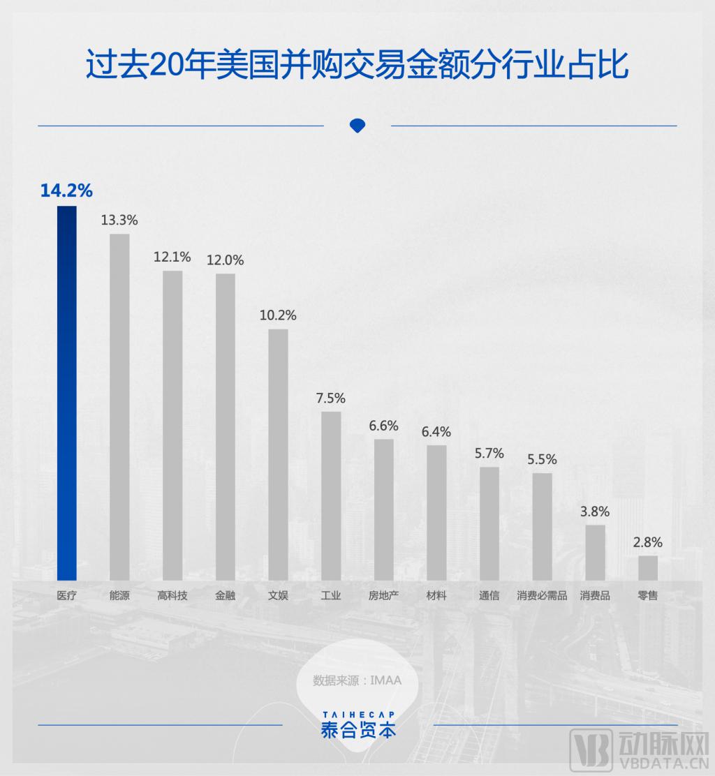 其中,2000年以來的發(fā)展歷程對中國市場而言更具參考價值。我們將這二十余年的時間軸放大,可以發(fā)現(xiàn)醫(yī)療健康行業(yè)是美國并購交易最活躍的領(lǐng)域。在過去20年中,美國總計發(fā)生超過24萬起并購交易,交易額累計約為28萬億美金。其中醫(yī)療健康行業(yè)的并購交易規(guī)模最大,超過傳統(tǒng)的能源、TMT科技以及金融行業(yè),交易額近4萬億美金,占比超過14%,在所有行業(yè)中位列第一。作為醫(yī)療體系的核心提供方,醫(yī)院也是美國醫(yī)療行業(yè)整合的最熱點領(lǐng)域,若以人民幣計,其每年并購標(biāo)的總收入累計超千億元規(guī)模。