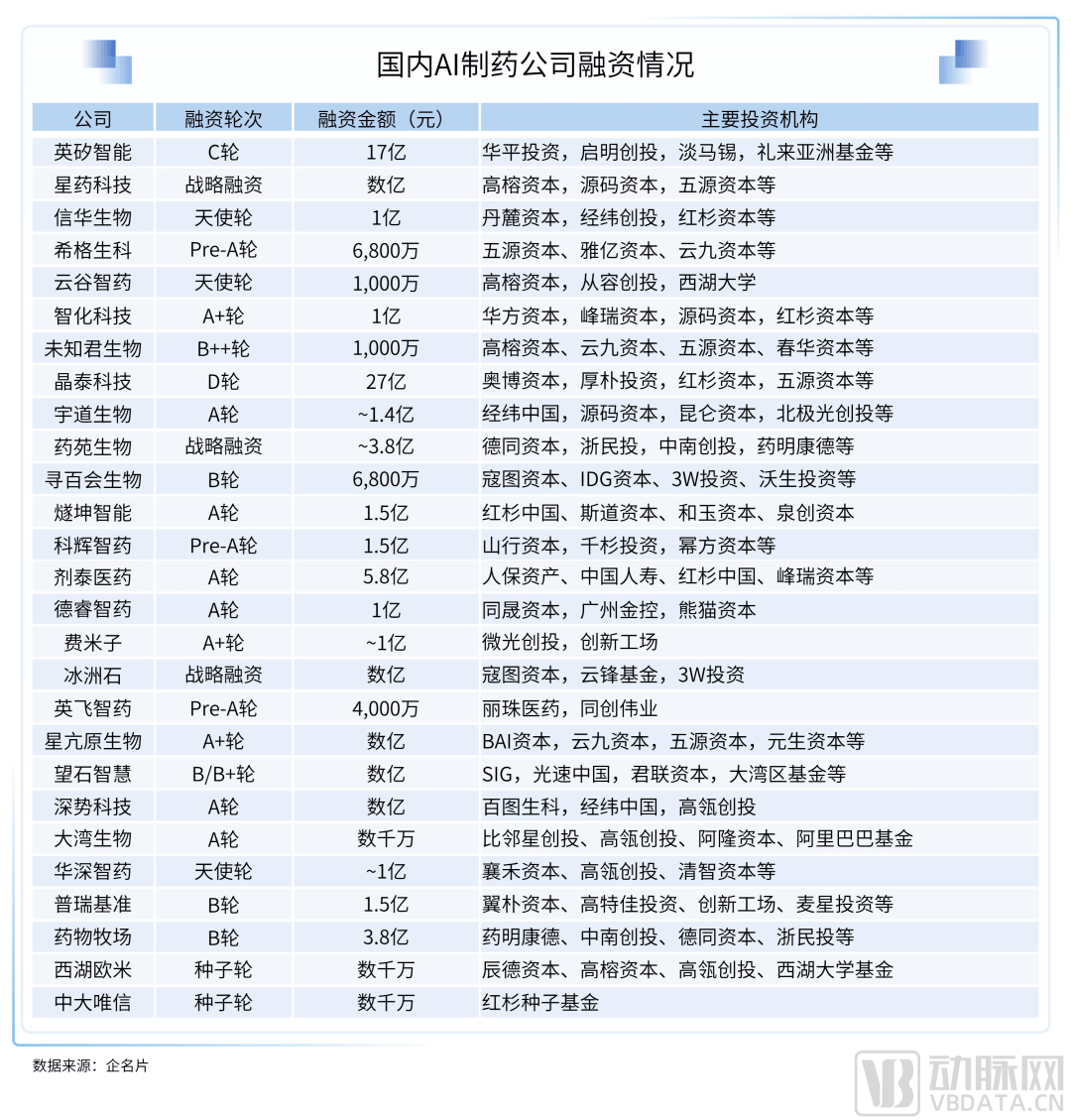融資方面,行業(yè)融資額集中度較高——晶泰科技在2020年憑借超過(guò) 3 億美金融資占據(jù)了全年國(guó)內(nèi) AI+制藥領(lǐng)域融資的 70%,2021年,晶泰D輪融資完成,融資額4億美金,融資額約占2021年整體AI藥物研發(fā)融資額的60%,整體估值超130億元人民幣,一舉奠定了其國(guó)內(nèi)行業(yè)獨(dú)角獸的地位。其他AI藥物研發(fā)公司,如星藥科技以及望石智慧等公司也順利完成了B+輪次的融資,由于頭部公司快速融資,行業(yè)升級(jí)帶動(dòng)了資本熱度,也讓細(xì)分賽道內(nèi)涌現(xiàn)除了更多AI藥研公司。目前整個(gè)賽道發(fā)展尚偏早期,未來(lái)會(huì)逐步向中后期發(fā)力。