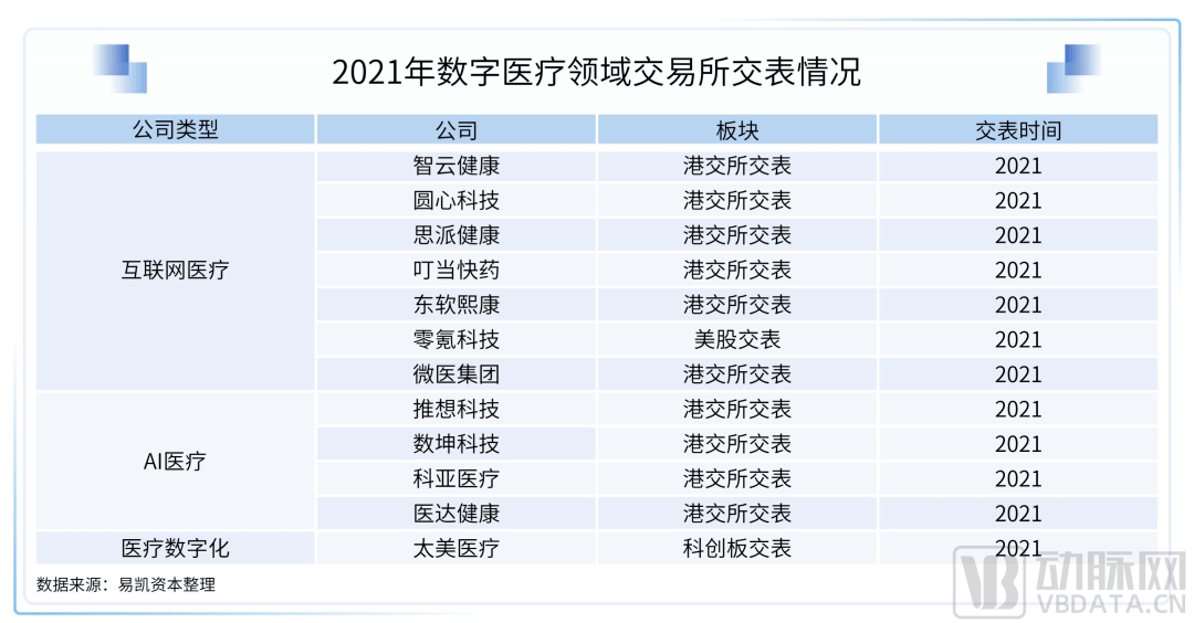 除了成功上市的6家公司之外,2021年數(shù)字醫(yī)療領(lǐng)域IPO交表數(shù)量遠(yuǎn)超此前所有之和,共有12家公司交表做上市準(zhǔn)備,其中10家選擇了港股,1家選擇了美股,1家選擇了A股科創(chuàng)板。這代表了數(shù)字醫(yī)療領(lǐng)域的第一波公司陸續(xù)發(fā)展成熟,紛紛走向沖刺IPO的道路。