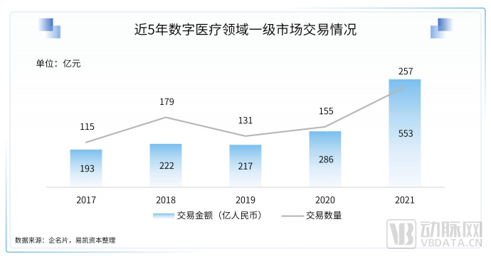 從近5年的市場(chǎng)交易情況來(lái)看,2021年對(duì)比前4年平均的交易金額,實(shí)現(xiàn)了近翻倍的增長(zhǎng)。中國(guó)2021年數(shù)字醫(yī)療領(lǐng)域共發(fā)生了257起融資事件,融資額總計(jì)553億元,比上年分別增長(zhǎng)66%和93%,平均單筆融資額約2億元。