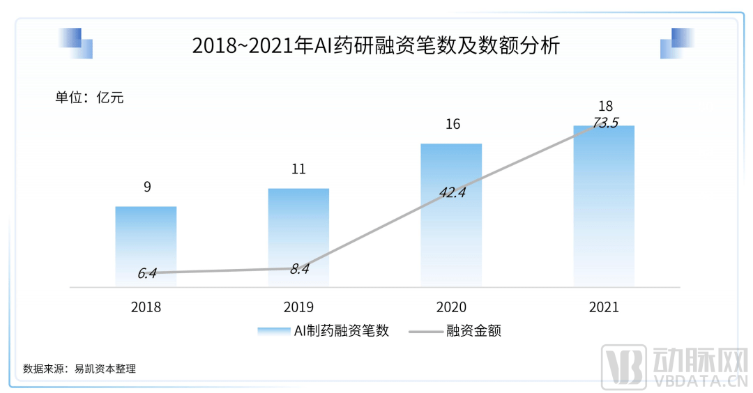 從2018至2021 年,據(jù)不完全統(tǒng)計(jì),全國(guó)共有約54起 AI+藥物研發(fā)融資事件,參投機(jī)構(gòu)(VC、基金、產(chǎn)業(yè)資本)190 家,累計(jì)融資總額近 130億人民幣。2020 和2021年兩年是國(guó)內(nèi)AI藥研領(lǐng)域極具轉(zhuǎn)折性的兩年,融資項(xiàng)目數(shù)量和整體融資額實(shí)現(xiàn)翻倍增長(zhǎng),大部分AI藥物研發(fā)公司也成功從初創(chuàng)期快速邁入了成長(zhǎng)期,資本熱度高漲。
