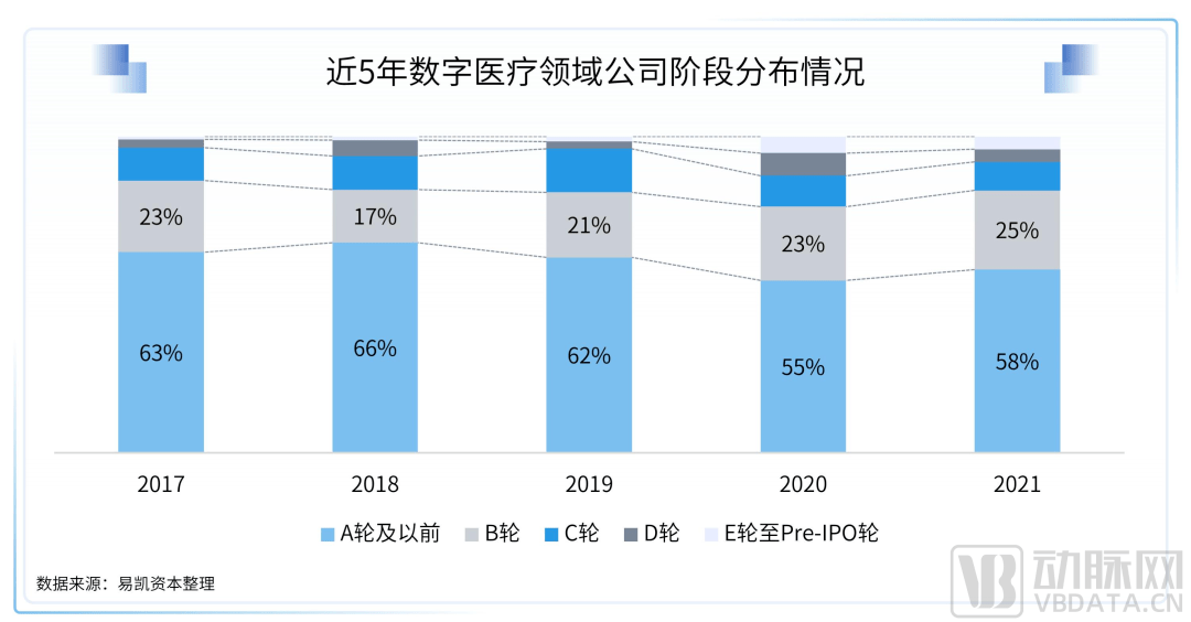 中國(guó)數(shù)字醫(yī)療領(lǐng)域大部分公司仍然處于中早期階段,整體產(chǎn)業(yè)在不斷成熟過(guò)程中,其中部分領(lǐng)域格局已逐漸清晰,第一梯隊(duì)公司率先步入上市進(jìn)程。D輪至Pre-IPO輪項(xiàng)目數(shù)量占比逐年增加,也彰顯著數(shù)字醫(yī)療領(lǐng)域已從早期探索,邁向成熟的快車道。