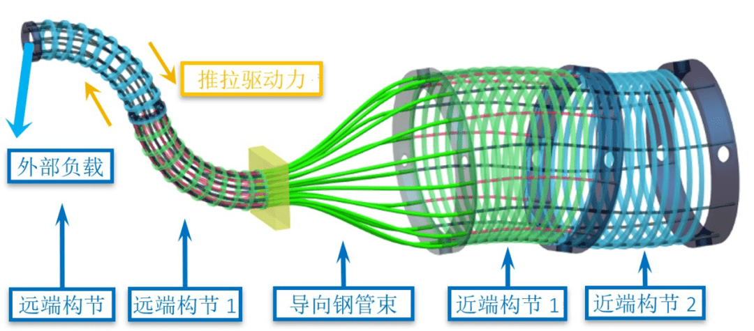 如圖所示,“可形變對偶連續(xù)體機(jī)構(gòu)”由近端構(gòu)節(jié)、導(dǎo)向鋼管束以及遠(yuǎn)端構(gòu)節(jié)組成,超彈性鎳鈦合金細(xì)桿作為結(jié)構(gòu)骨從頭至尾貫穿。近端構(gòu)節(jié)的彎轉(zhuǎn),會帶來十余根結(jié)構(gòu)骨的推拉運(yùn)動,這些推拉運(yùn)動傳遞到遠(yuǎn)端構(gòu)節(jié),協(xié)同將遠(yuǎn)端構(gòu)節(jié)向相反的方向彎轉(zhuǎn)。