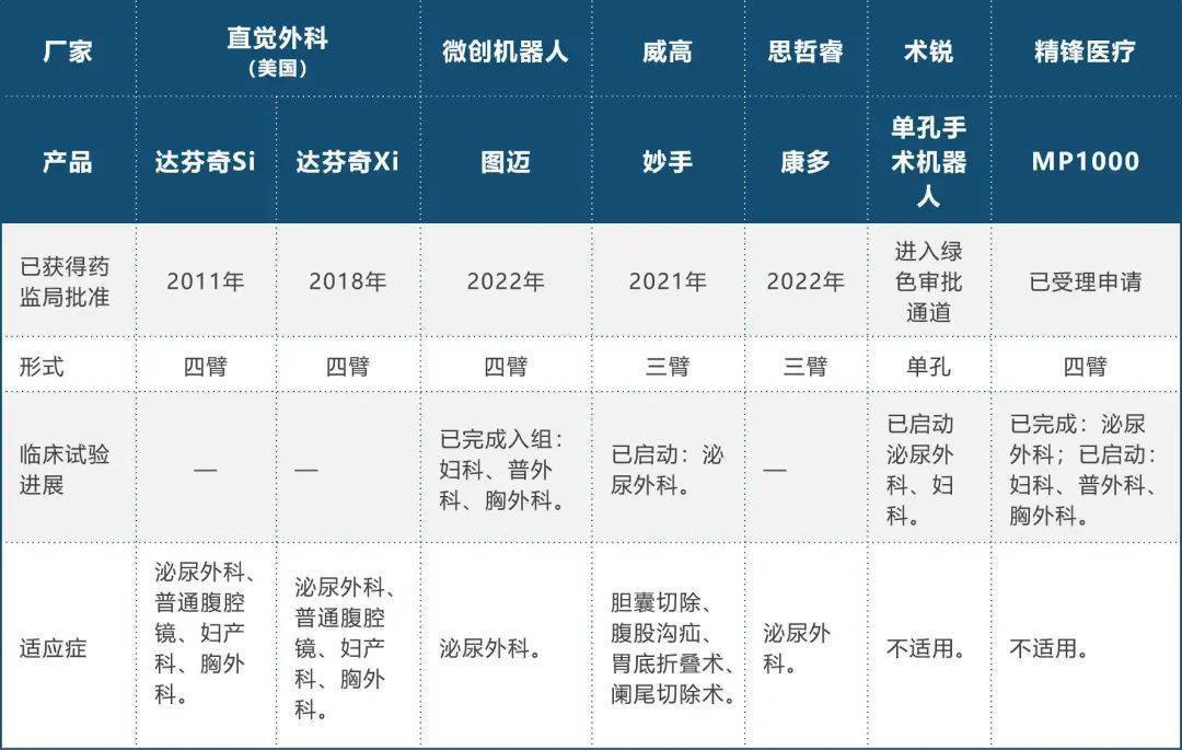 目前市場在售的產(chǎn)品中,直覺外科的兩款手術(shù)機(jī)器人適應(yīng)癥范圍最為廣泛,國產(chǎn)的三款產(chǎn)品中圖邁和康多目前適用于泌尿外科手術(shù),妙手適用于消化道相關(guān)手術(shù)。