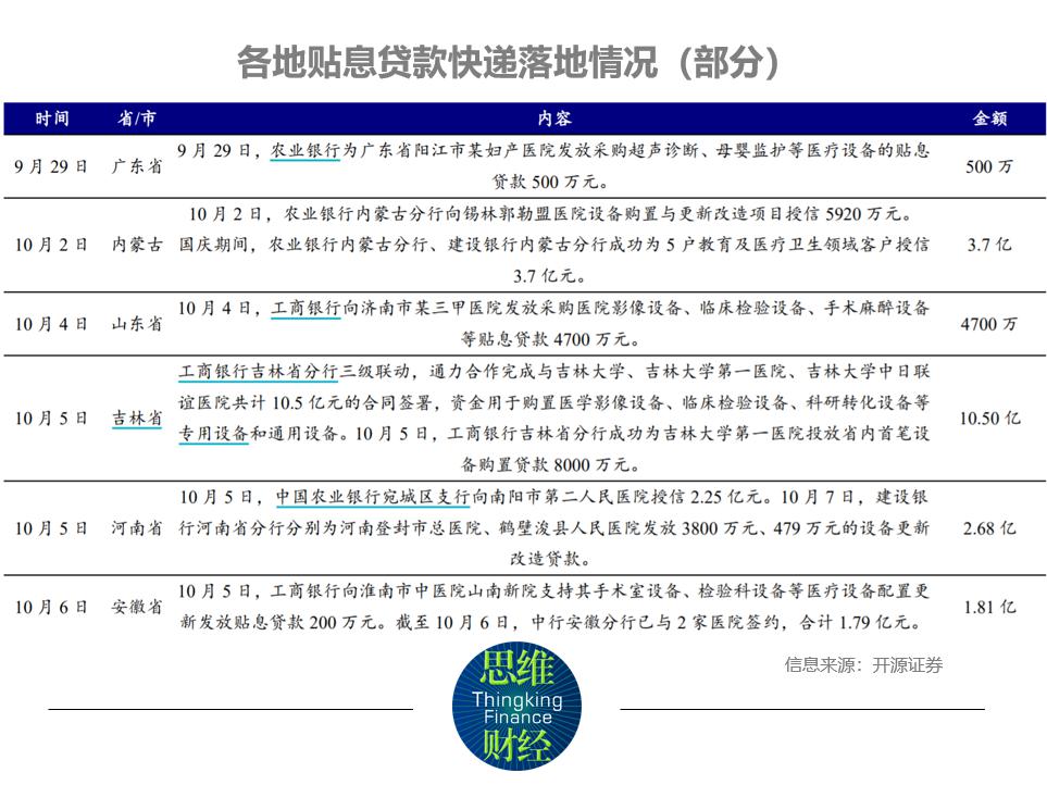 目前各省市積極響應(yīng)政策,已開(kāi)始執(zhí)行使用財(cái)政貼息貸款更新改造醫(yī)療設(shè)備需求的調(diào)查工作,截至 9 月 30 日,僅浙江、江蘇、安徽等省已上報(bào)約 180 億元的設(shè)備采購(gòu)需求。全國(guó)數(shù)千億級(jí)醫(yī)療設(shè)備更新改造需求即將釋放。十一國(guó)慶期間財(cái)政貼息貸款項(xiàng)目單位與銀行積極簽約對(duì)接保障工作,目前各地貼息貸款快速落地,截至 10 月 11 日公開(kāi)數(shù)據(jù),各省市已落地貼息金額約 191.55 億元。