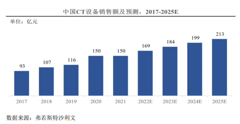 ??2021年,中國CT市場總規(guī)模達(dá)150億元,預(yù)計(jì)到2025年,中國CT設(shè)備總銷售額將增長至213億元,年復(fù)合增長率達(dá)到9.2%。