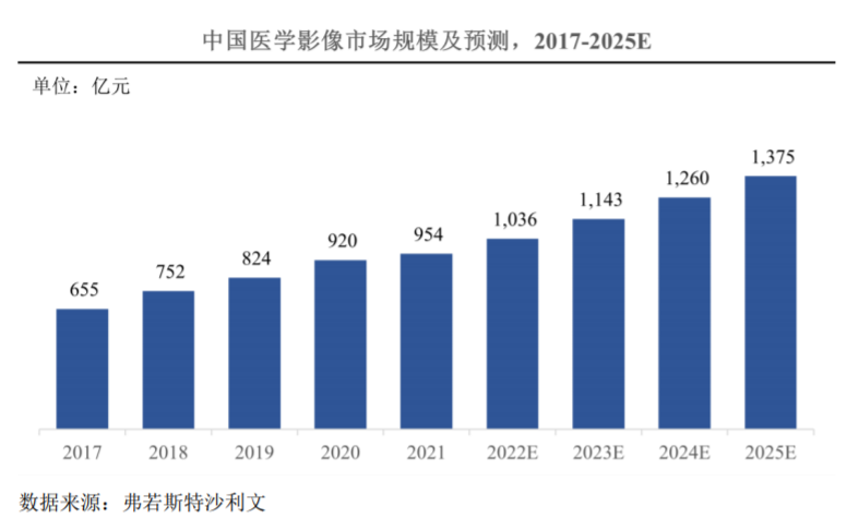 ??在市場需求及政策紅利的雙重驅(qū)動(dòng)下,我國醫(yī)學(xué)影像設(shè)備市場規(guī)模將持續(xù)增長,具備良好的發(fā)展前景。2021年市場規(guī)模已達(dá)到954億元,預(yù)計(jì)2025年市場規(guī)模將達(dá)到1,375億元,年均復(fù)合增長率預(yù)計(jì)將達(dá)到9.6%。