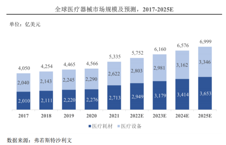 ??隨著全球人口老齡化問題的不斷加劇以及慢性病患者數(shù)的持續(xù)增加,推動(dòng)了全球醫(yī)療器械市場的穩(wěn)定發(fā)展。自2017年至2021年,全球醫(yī)療器械市場規(guī)模從4,050億美元增長到5,335億美元,年復(fù)合增長率為7.1%。全民健康意識(shí)的進(jìn)一步提升將促進(jìn)該增長趨勢延續(xù),預(yù)計(jì)2025年全球醫(yī)療器械市場規(guī)模將增長到6,999億美元,其中醫(yī)療設(shè)備市場份額約占整體的47.81%。