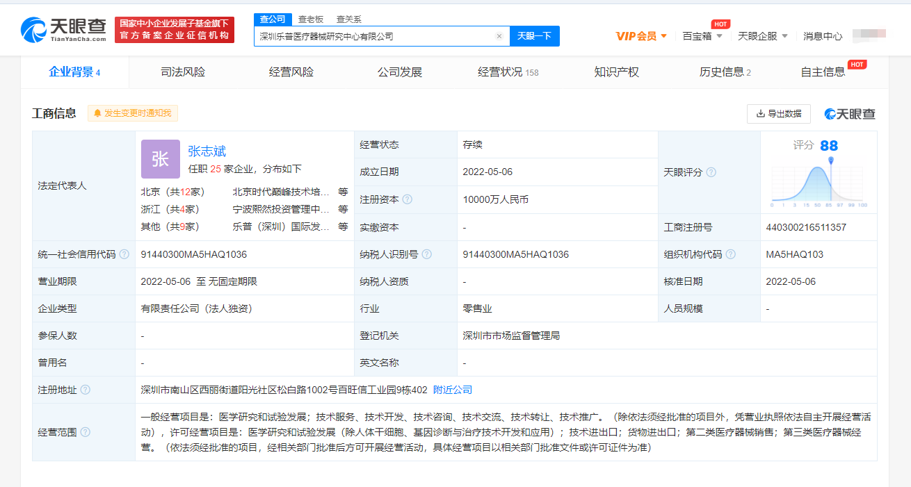 近日,深圳樂普醫(yī)療器械研究中心有限公司成立,法定代表人為張志斌,注冊資本1億人民幣。公司經營范圍包括醫(yī)學研究和試驗發(fā)展;技術服務;技術開發(fā);醫(yī)學研究和試驗發(fā)展等。股權穿透圖顯示,該公司由樂普(北京)醫(yī)療器械股份有限公司間接全資控股。