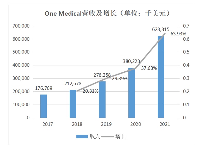 2017至2021年,One Medical營收連年實(shí)現(xiàn)增長,從2017年的1.77億美元增至2021年的6.23億美元。增長率也一直在增加,2021年的增長率達(dá)到63.93%。