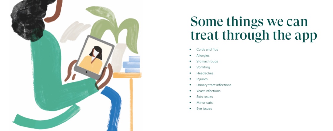One Medical通過移動(dòng)應(yīng)用,提供24/7的視頻護(hù)理服務(wù)、預(yù)約護(hù)理、線上續(xù)處方等服務(wù),可處理的病況包括感冒和流感、過敏、胃病、嘔吐、頭痛、受傷、尿路感染、酵母菌感染、皮膚問題、小切口以及眼睛問題。因此,患者在任何時(shí)間內(nèi)都可以獲得線上護(hù)理。