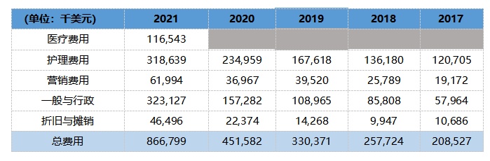 One Medical的費(fèi)用包括醫(yī)療費(fèi)用、護(hù)理、營銷、一般與行政以及折舊與攤銷。其中,醫(yī)療費(fèi)用只在2021年度有所體現(xiàn),代表的是Medicare業(yè)務(wù)產(chǎn)生的醫(yī)療費(fèi)用。在剩余項(xiàng)目中,占比最高的為護(hù)理費(fèi)用,這部分包括開設(shè)線下診所以及招募護(hù)理員工和供應(yīng)商的費(fèi)用。