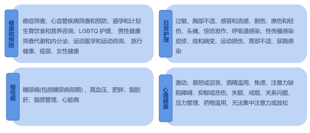 線下護(hù)理涵蓋健康和預(yù)防、日常護(hù)理、慢性病、心理健康,性健康、LGBTQ+服務(wù)等,具體如下。
