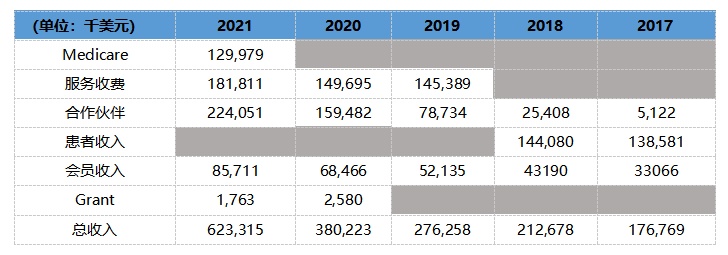 One Medical通過兩個(gè)渠道開展業(yè)務(wù),第一個(gè)是直接面向消費(fèi)者,第二個(gè)是通過雇主,提供員工福利。基于此,其收入來源包括消費(fèi)者、雇主、健康網(wǎng)絡(luò)和保險(xiǎn)公司,主要包括以下三個(gè)方面:1)年度雇主和消費(fèi)者的訂閱費(fèi)用;2)伙伴關(guān)系收入,主要以每個(gè)成員的每月收入(PMPM)為基礎(chǔ),來自健康網(wǎng)絡(luò)和企業(yè)客戶對(duì)線下醫(yī)療服務(wù)的固定付款,以及3)健康保險(xiǎn)公司和患者每次就診的患者服務(wù)凈收入。