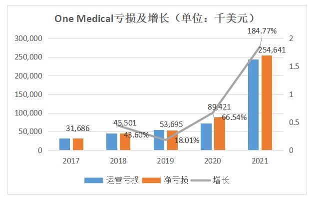 One Medical的運(yùn)營虧損和凈虧損都在逐年增長,尤其在2021年,凈虧損較之前增長了184.77%,達(dá)到2.55億美元。虧損和One Medical不斷拓展的醫(yī)療資源和合作關(guān)系有關(guān)。例如,在2021年第一季度,One Medical與得克薩斯州最大的非盈利性醫(yī)療系統(tǒng)Baylor Scott & White達(dá)成合作,導(dǎo)致第一季度的虧損翻倍。