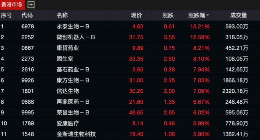 實際上,近日以來,醫(yī)療行業(yè)暖風(fēng)頻吹,相關(guān)股票表現(xiàn)也比較活躍。截至發(fā)稿,港股的永泰生物上漲超15%,康哲藥業(yè)、固生堂上漲超8%,基石藥業(yè)、康方生物、信達生物上漲超7%。