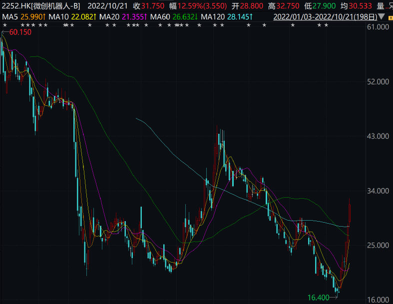 其實。從今年整體情況看,微創(chuàng)機器人股價跌幅將近32%,年初從60.15港元/股的高位一路震蕩下跌,3月跌幅非常大,6月出現(xiàn)一波反彈,但隨后又繼續(xù)調(diào)整,10月一度跌至16.4港元/股的低位,直到最近才重拾升勢。我們一起來看看發(fā)生了什么?