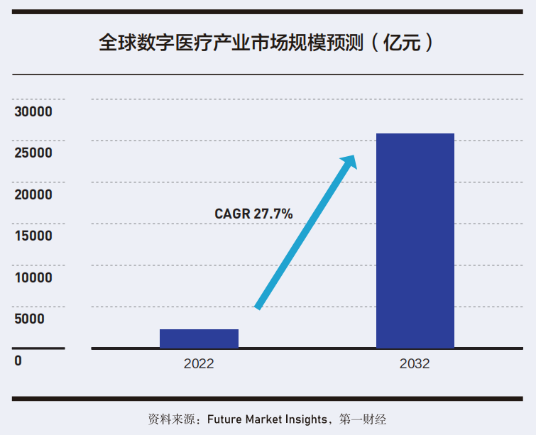 Future Market Insights預(yù)測,2022-2032年,全球數(shù)字醫(yī)療市場將以27.7%的年均復(fù)合增長率高速增長,到2032年,市場規(guī)模有望達(dá)到25859.8億元。
