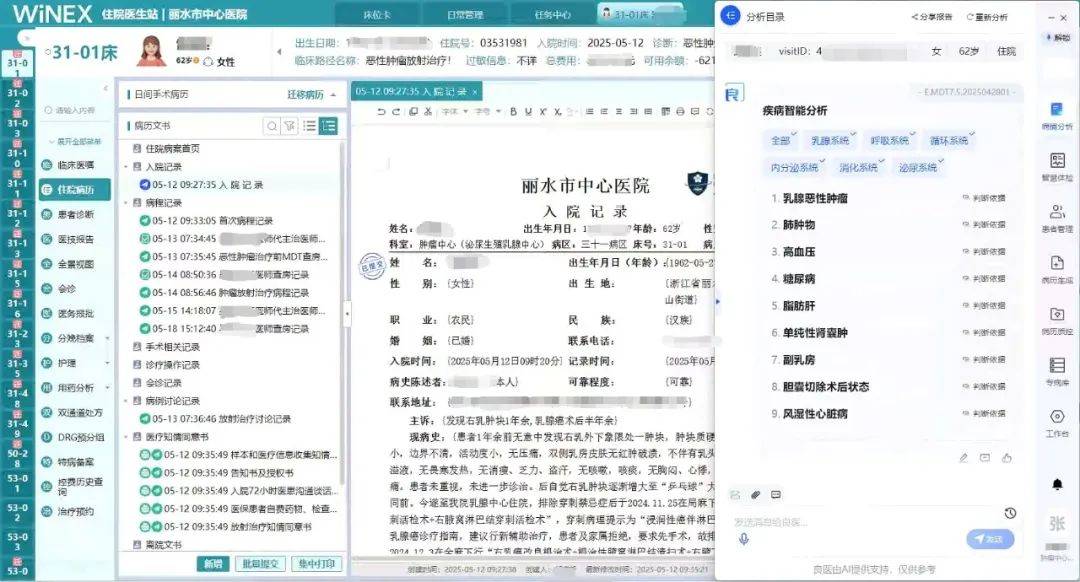 診中環(huán)節(jié),病情分析功能通過整合患者全維數(shù)據(jù),可輔助醫(yī)生快速了解就診患者過往病史、用藥史、手術(shù)史等等,且結(jié)合給出的科學(xué)決策參考,能更快速的為患者制定個性化診療意見。