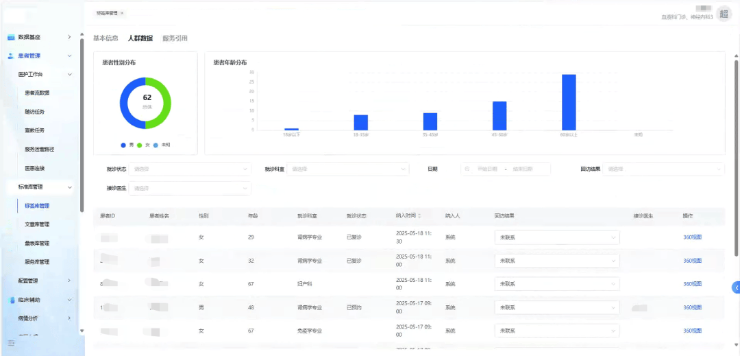 診后環(huán)節(jié),患者管理功能通過整合患者全場景數(shù)據(jù),結(jié)合可視化看板,在清晰患者動態(tài)之余,可依托自主配置規(guī)則和觸發(fā)條件設(shè)定,精準(zhǔn)定位目標(biāo)患者群體,實現(xiàn)宣教、隨訪等信息的自動精準(zhǔn)推送,打通從醫(yī)院到患者端健康管理服務(wù)閉環(huán),減輕醫(yī)護人員工作負(fù)擔(dān),進一步提升患者健康管理和就醫(yī)體驗。